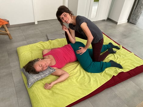 Eine Thai Yoga Massage wird in bequemer Kleidung auf einer Matte durchgeführt. Sie kann in Rücken-, Bauch-, Seitenlage oder im Sitzen erfolgen.